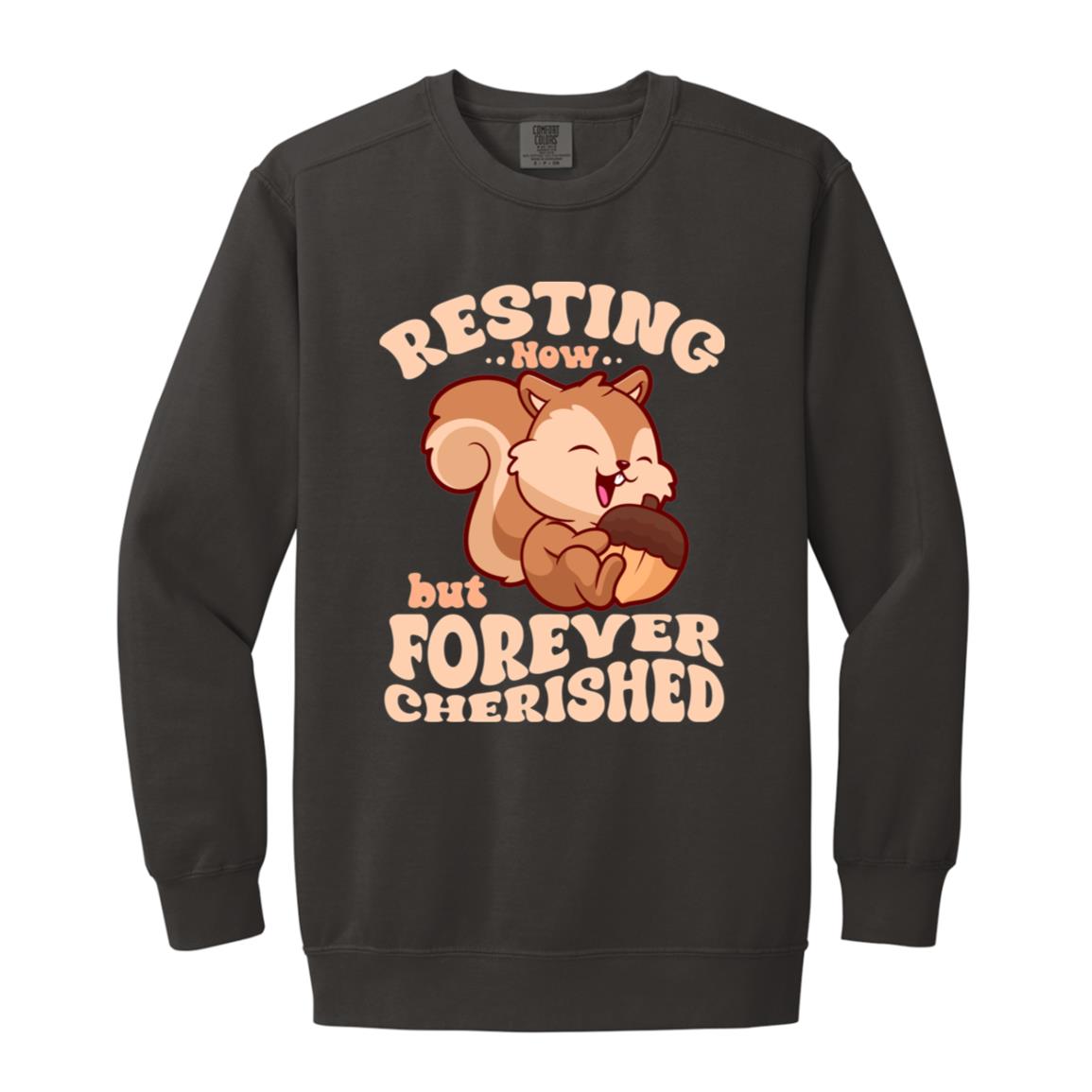 Resting Now but Forever Cherished Memorial Sweatshirt – Cute Squirrel Design, Bereavement Apparel, Remembrance Gift, Sympathy Hoodie for Comfort and Support